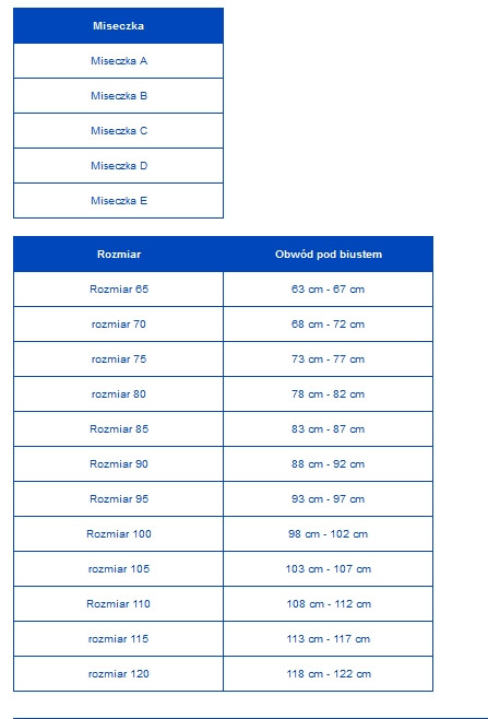 Zmierz obwód pod biustem zaczynając od mostka, przyłóż centymetr dookoła klatki piersiowej i lekko napnij (bez nadmiernego ucisku). Wynik zaokrąglasz w dół, do liczby będącej wielokrotnością piątki, np. przy 92 cm Twój rozmiar pod biustem to 90. Jeśli natomiast masz w obwodzie 74 cm, Twój idealny rozmiar to 75 cm.