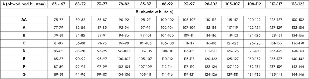 Zmierz obwód pod biustem zaczynając od mostka. Przyłóż centymetr dookoła klatki piersiowej i lekko napnij (bez nadmiernego ucisku). Wynik zaokrąglasz w dół, do liczby będącej wielokrotnością piątki, np. przy 92 cm Twój rozmiar pod biustem to 90. Jeśli natomiast masz w obwodzie 74 cm, Twój idealny rozmiar to 75 cm.