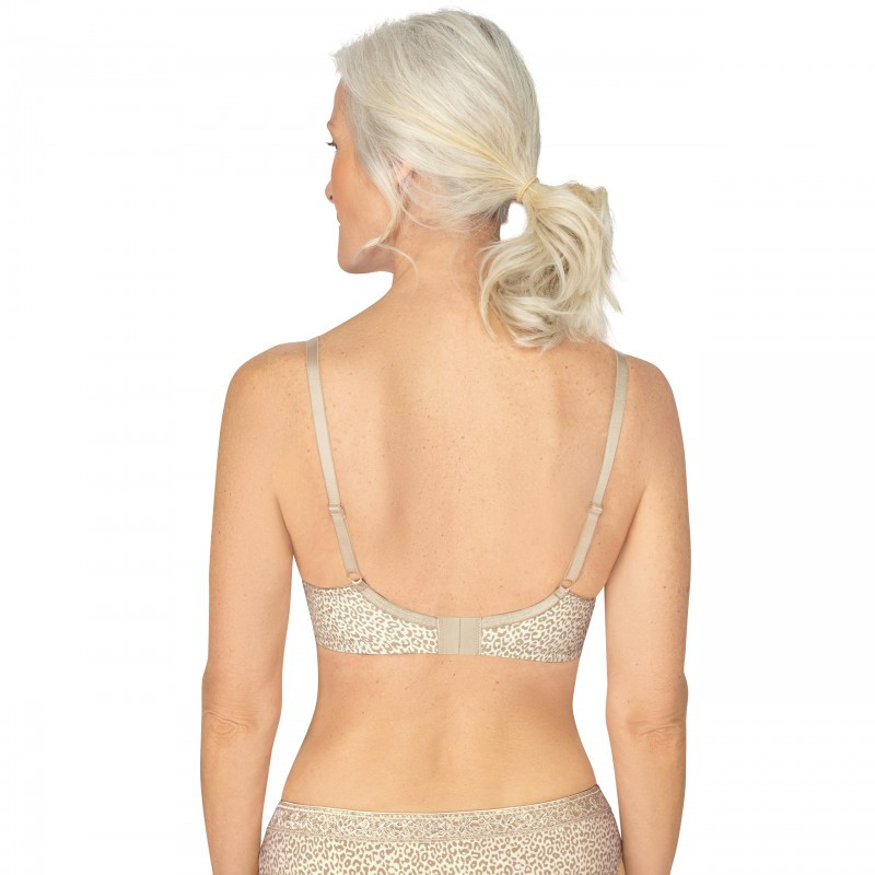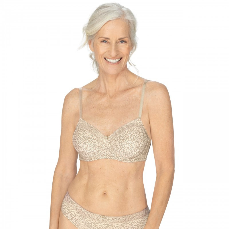 Amoena Bliss WB 44786 zwraca na siebie uwagę łatkami, które przypominają delikatną panterkę. Biustonosz protetyczny jest na fiszbinach. W górnej części miseczek zachwyca koronką.