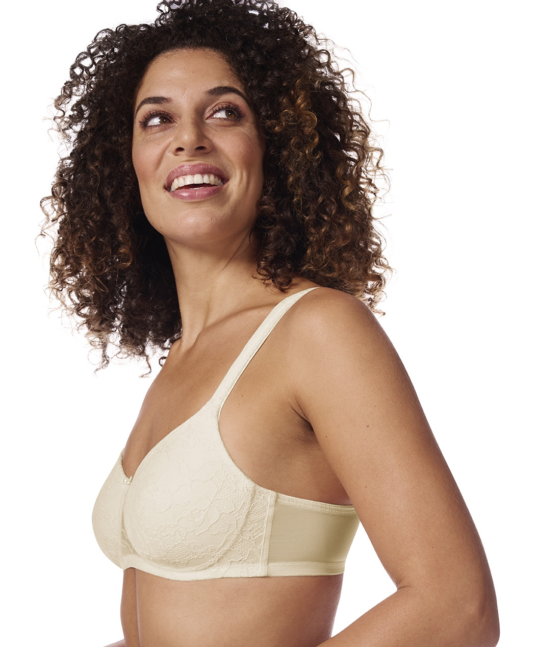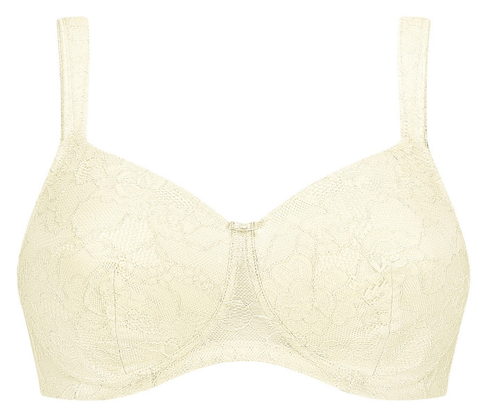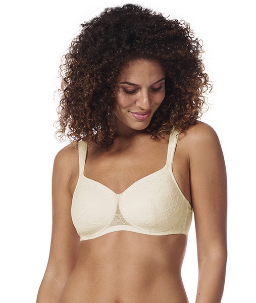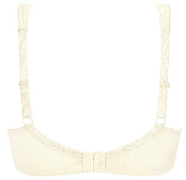 Zastosowana w projekcie trójdzielna miseczka modeluje biust, nadając mu naturalny i harmonijny kształt. Delikatna koronka połączona z miękką podszewką z mikrofibry sprawia, że biustonosz prezentuje się wyjątkowo kobieco, a jednocześnie pozostaje niezauważalny pod ubraniem. Wyższe boki i tył zwiększają stabilność, a regulowane, miękko wyściełane ramiączka odciążają ramiona.