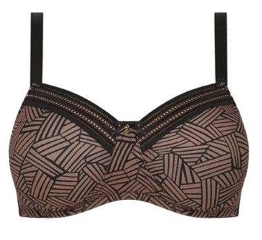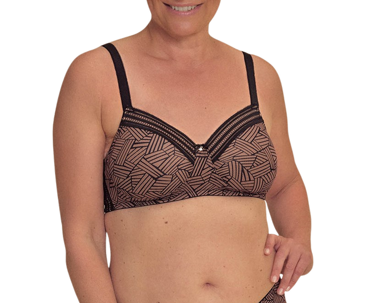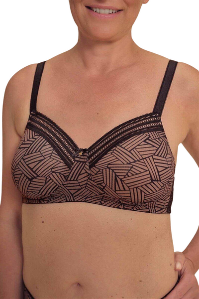 Nowoczesny, koronkowy nadruk w połączeniu z ozdobnymi paskami przy dekolcie i po bokach sprawia, że biustonosz wygląda jak klasyczna, elegancka bielizna - a nie wyrób medyczny.