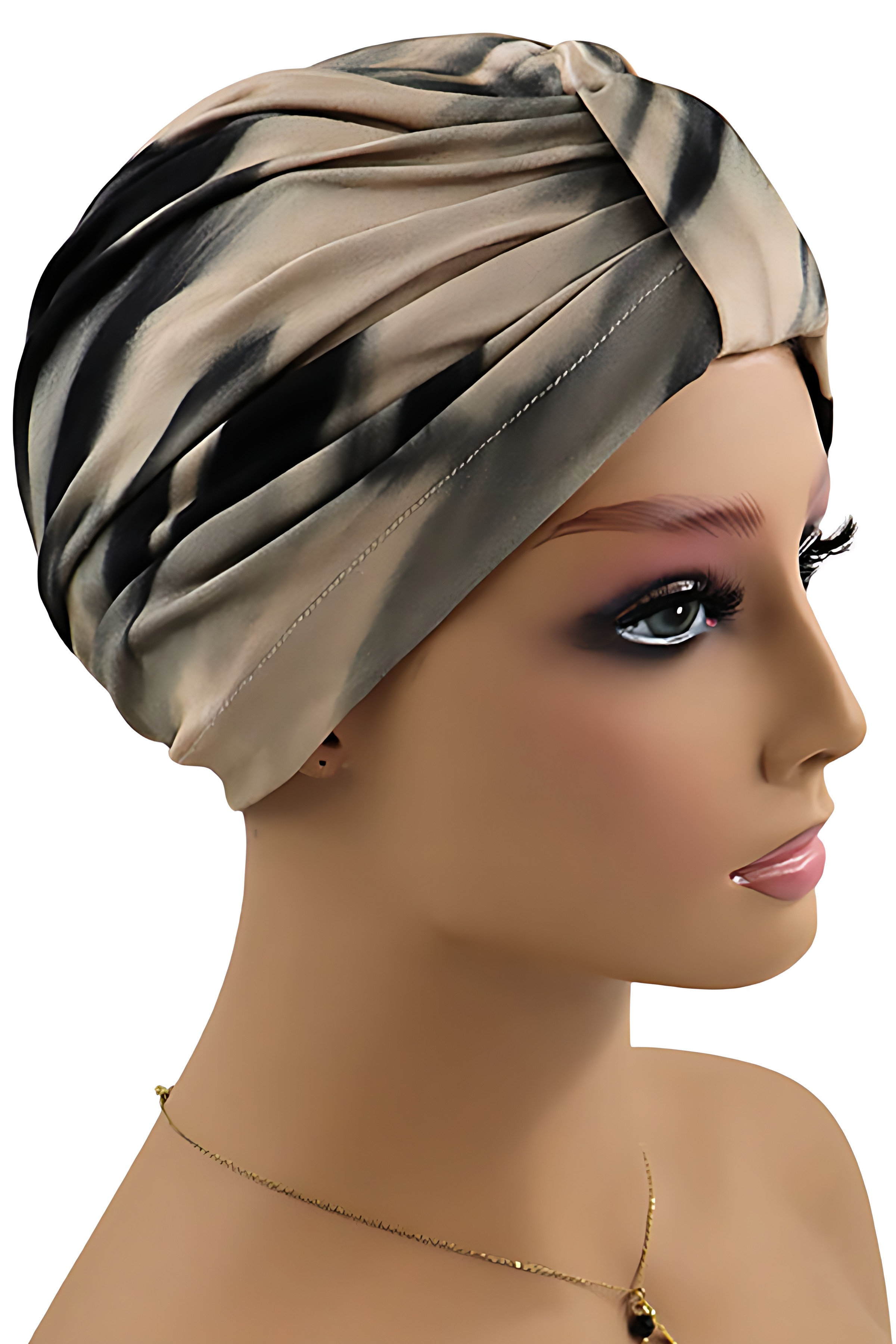 Przyjemny dla skóry turban uszyty z bambusowej wiskozy w różnych odcieniach i wzorach do wyboru. Jest to model gotowy do nałożenia, nie wymaga formowania na głowie ani zawiązywania. Rozmiar jest uniwersalny, dzięki czemu pasuje na różne obwody głowy. Turban z ozdobnym spięciem i marszczeniami.