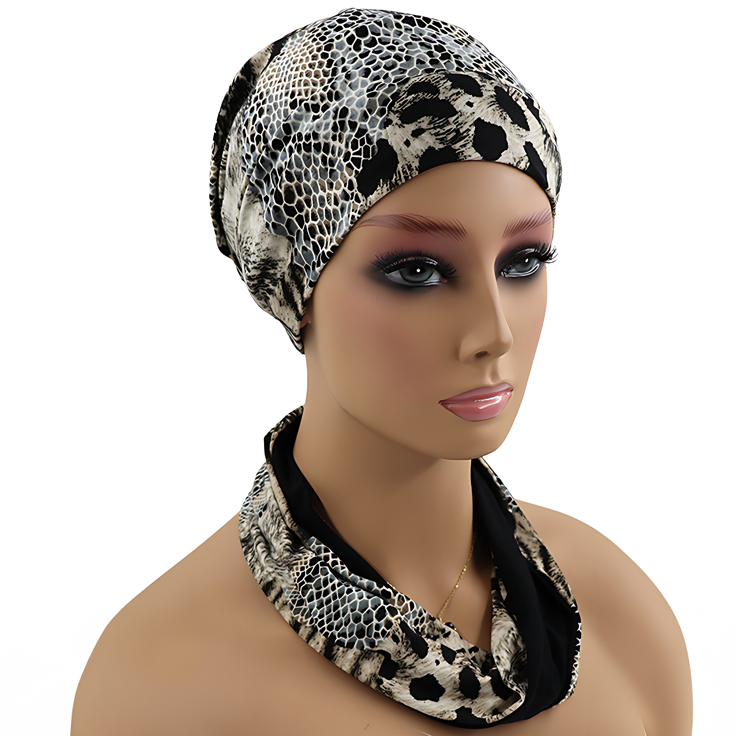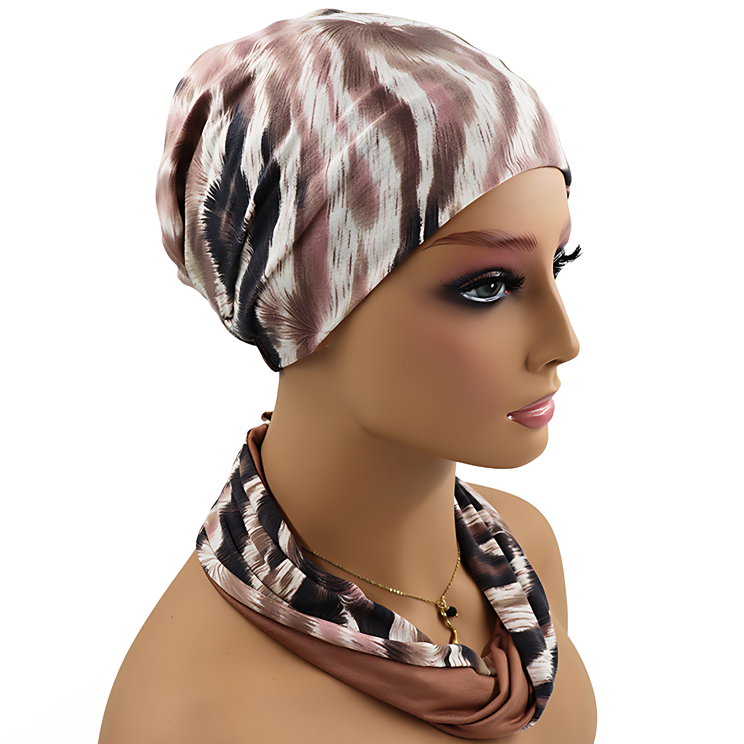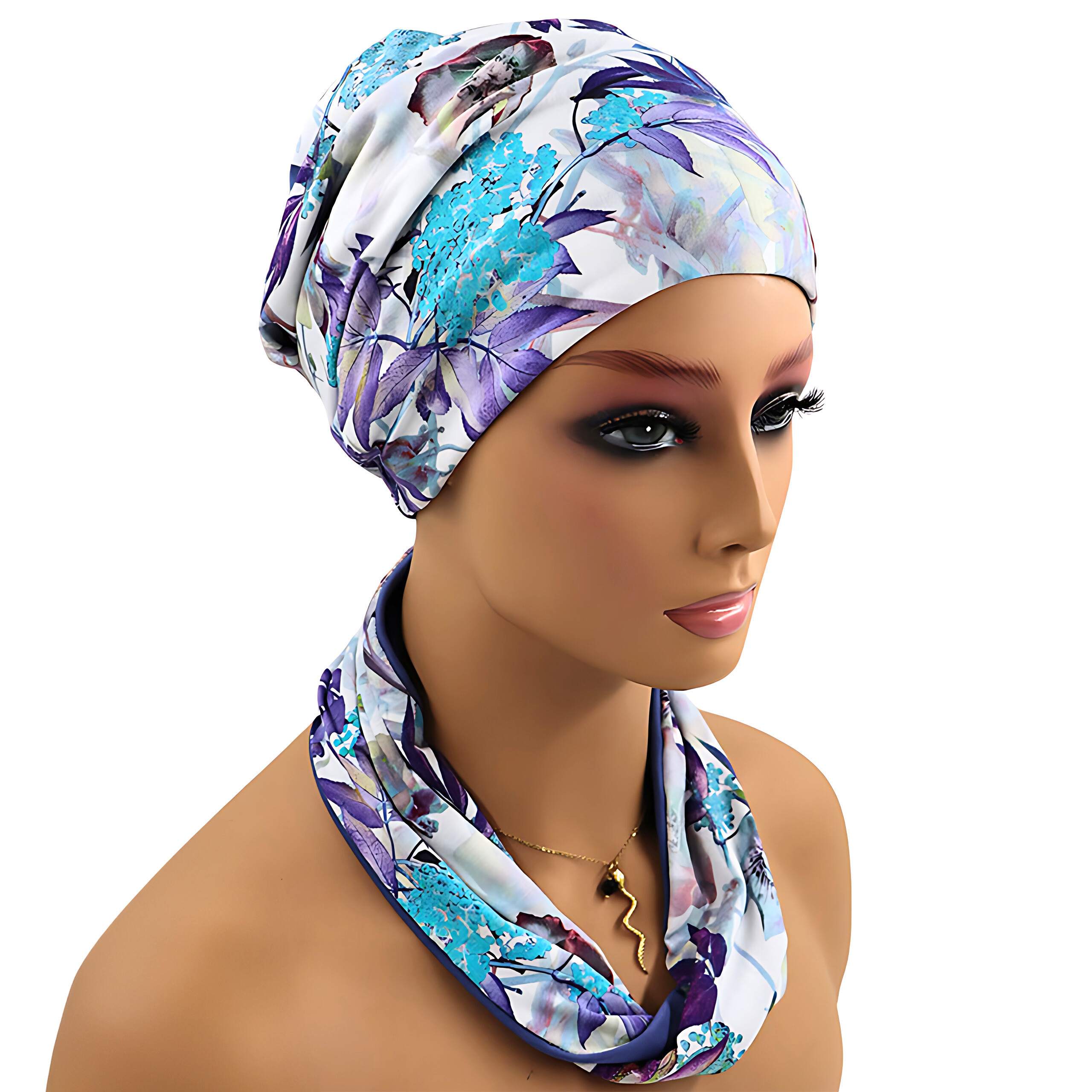 Przyjemny dla skóry turban w zestawie z opaską uszyty z bambusowej wiskozy w różnych wzorach do wyboru. Jest to model gotowy do nałożenia, nie wymaga formowania na głowie ani zawiązywania. Opaska może być założona na turban bądź jako stylowa apaszka na szyi, co zostało przedstawione na zdjęciach. Rozmiar jest uniwersalny, dzięki czemu pasuje na różne obwody głowy. Wszyta na karku gumka zapewnia wygodną regulację oraz sprawia, że turban nie będzie się zsuwał.