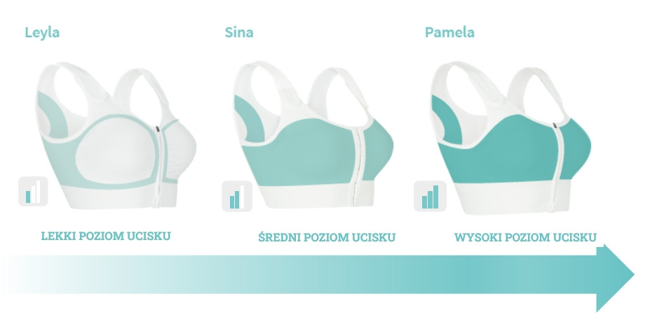 Na zdjęciu porównano trzy modele biustonoszy kompresyjnych Amoena: Leyla (lekki ucisk), Sina (średni ucisk) oraz Pamela (wysoki ucisk). Biustonosz Amoena Pamela wyróżnia się najwyższym poziomem stabilizacji i rekomendowany jest w pierwszych tygodniach po operacji piersi.