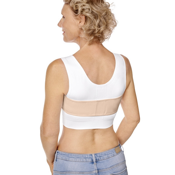 Pas został zaprojektowany tak, aby zapewnić optymalną kompresję górnej części piersi, stabilizację oraz komfort w kluczowym okresie rekonwalescencji. Pomaga utrzymać implant lub operowaną pierś we właściwej pozycji, ograniczając ryzyko przesunięć oraz podrażnień.