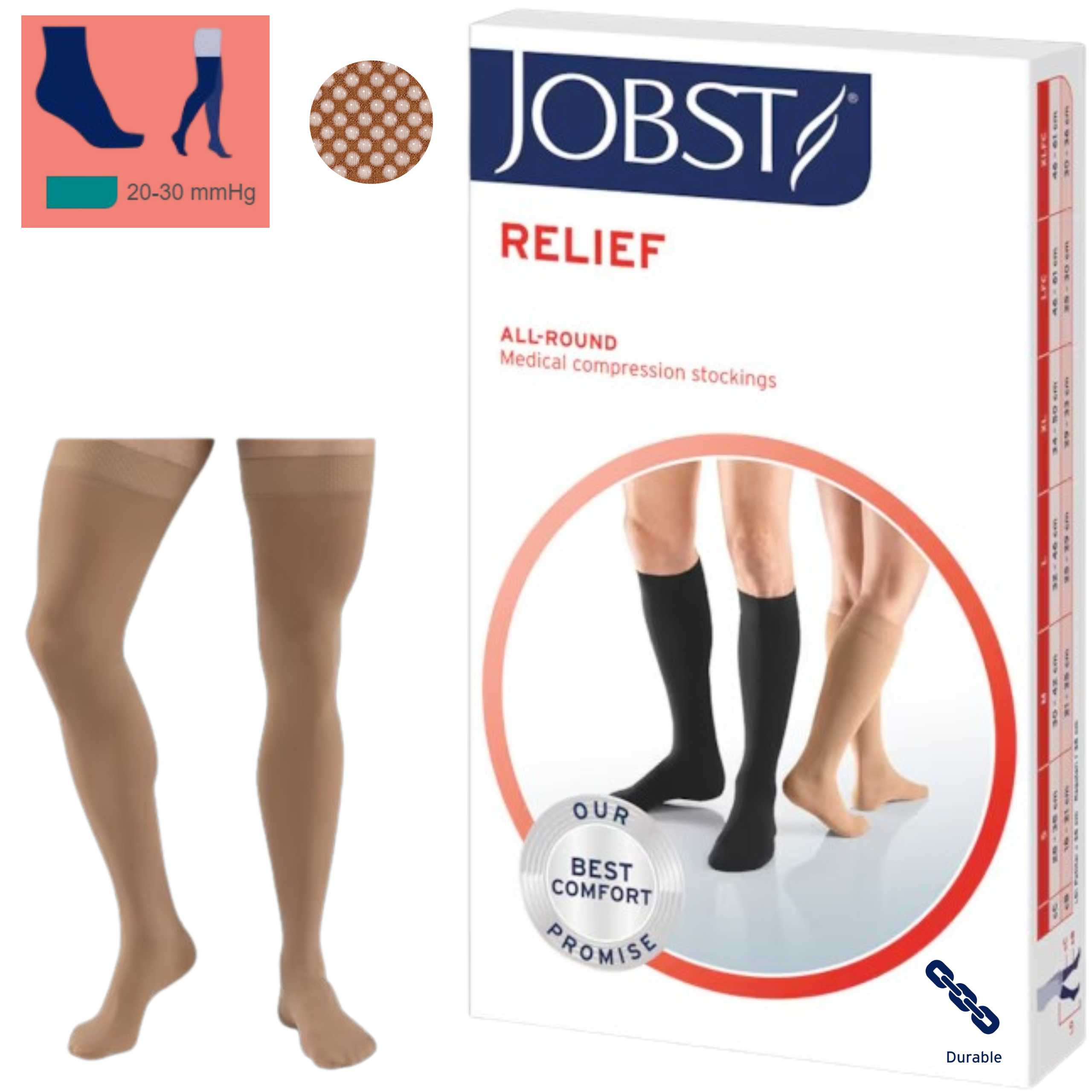 Pończochy uciskowe JOBST® Relief beżowe z zamkniętymi palcami to wyrób medyczny przeznaczony dla osób, które potrzebują skutecznego wsparcia w leczeniu i profilaktyce chorób żył. Dzięki stopniowanemu uciskowi poprawiają krążenie krwi, redukują obrzęki i łagodzą uczucie ciężkich nóg. Beżowy kolor sprawia, że pozostają dyskretne pod ubraniem, a zamknięte palce zapewniają pełne okrycie stopy oraz większy komfort w chłodniejsze dni.