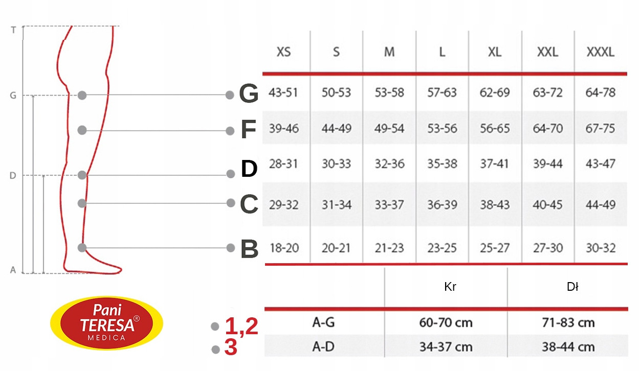 Odpowiednio dobrany rozmiar, jest podstawą właściwego działania terapeutycznego produktów uciskowych. W tym celu należy zmierzyć obwód obu nóg w miejscach wskazanych w tabeli rozmiarów.