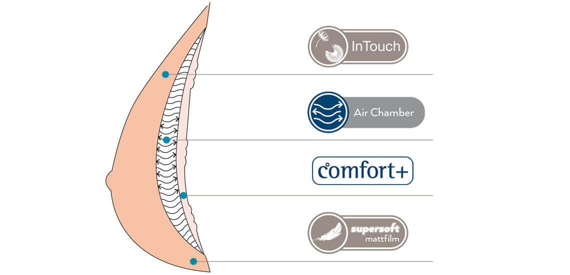- Strona zewnętrzna zawiera silikon InTouch, który jest do 40% lżejszy niż w protezie o standardowej wadze o tym samym rozmiarze.