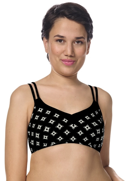 Nowoczesny czarno-biały wzór inspirowany motywami etnicznymi sprawia, że biustonosz wyróżnia się na tle klasycznych modeli. Dekolt w kształcie litery „V” dodaje kobiecego uroku i optycznie wydłuża szyję, a cienkie podwójne ramiączka nadają całości subtelny, elegancki wygląd.