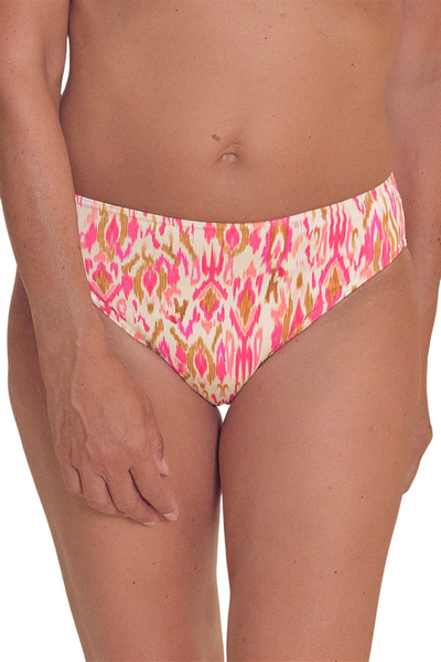 Majtki kąpielowe Amoena Istria PTY 71812 to połączenie modnego designu, wygody oraz wysokiej jakości materiałów. Model wyróżnia się wyjątkowym nadrukiem inspirowanym techniką ikat w odcieniach różu i naturalnych kolorach ziemi, co nadaje mu wakacyjny, kobiecy charakter. To idealny wybór dla kobiet poszukujących stylowych majtek kąpielowych, które zapewniają komfort zarówno na plaży, jak i na basenie.