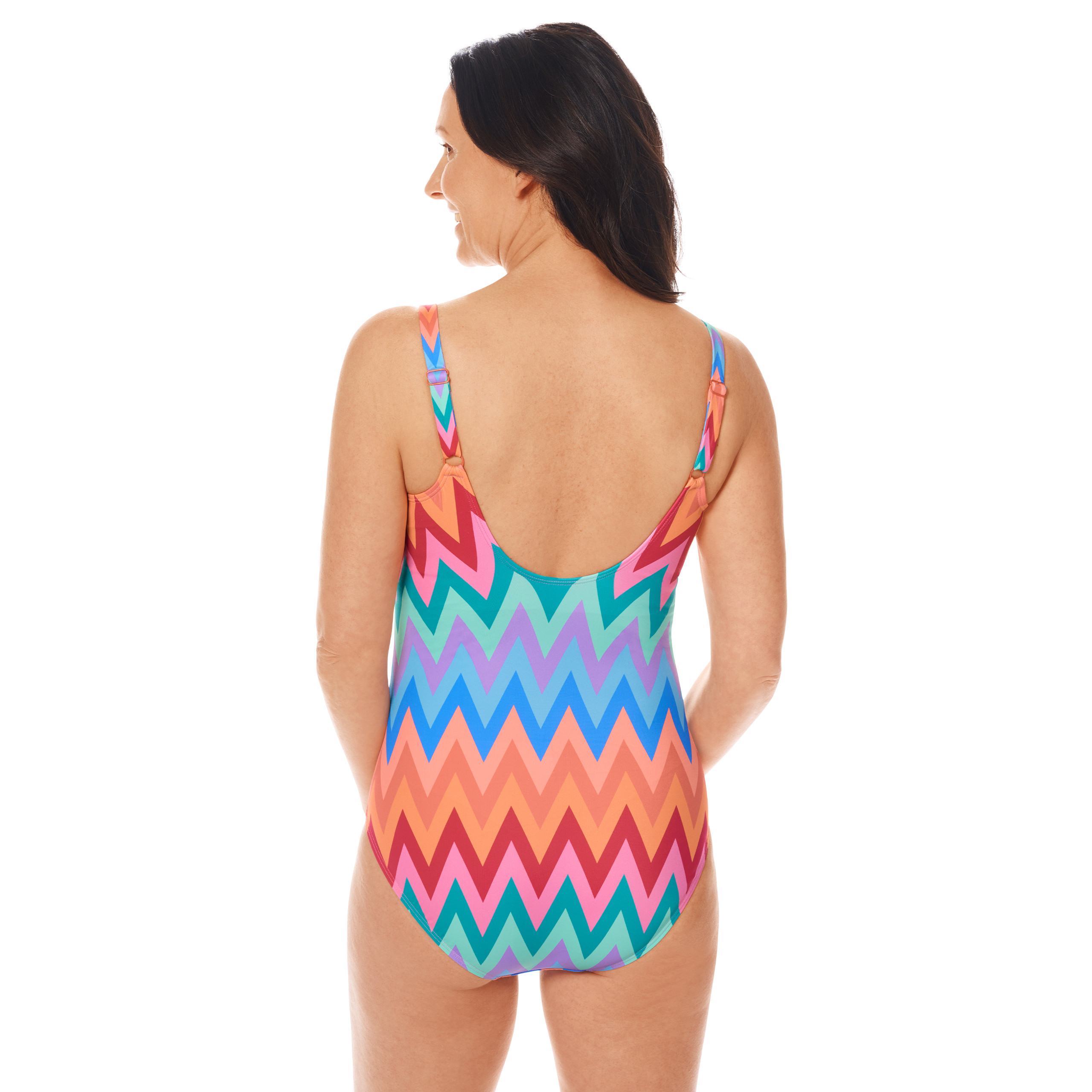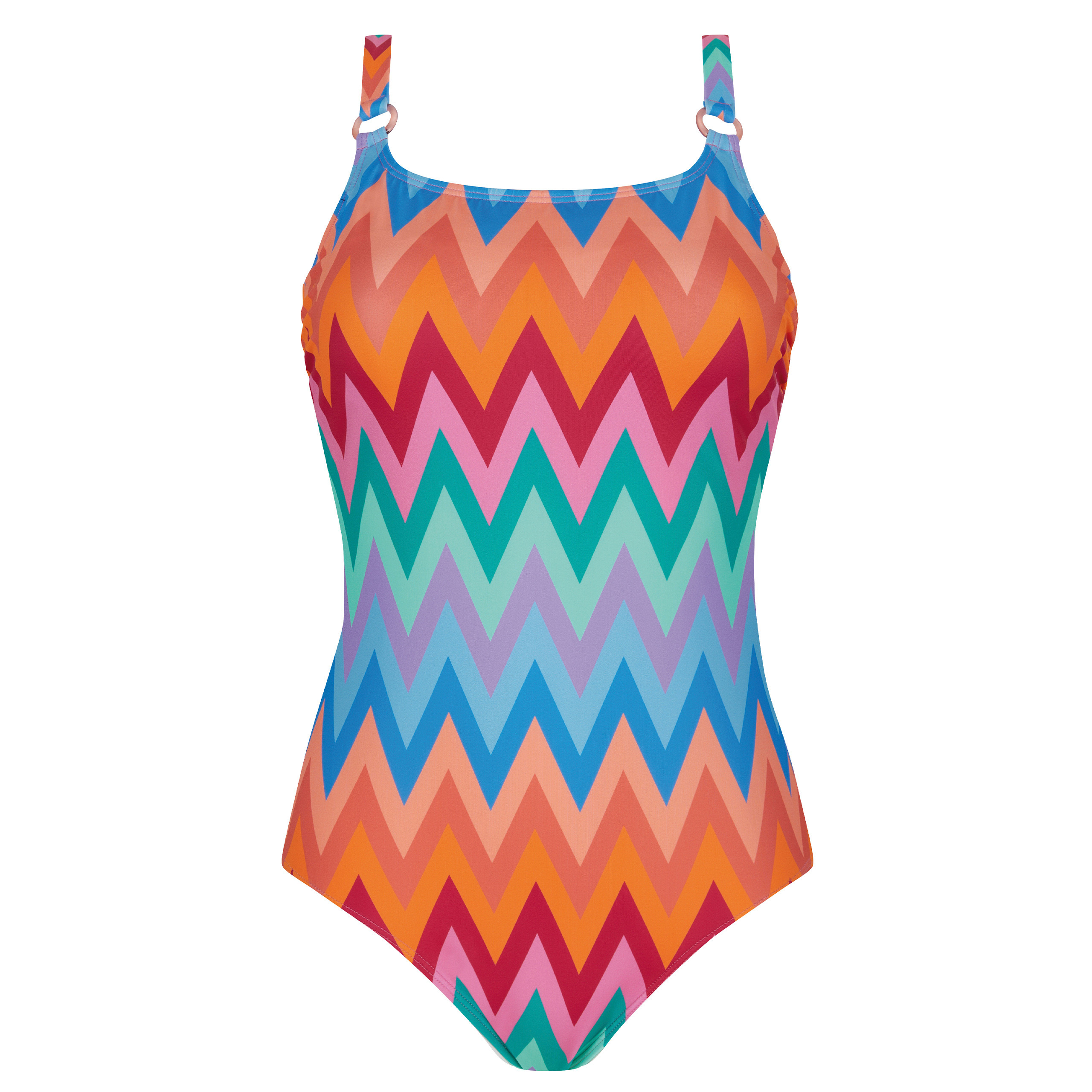 Elegancki strój kąpielowy jednoczęściowy z pięknym, intensywnym nadrukiem kolorowych zygzaków. Kostium zapewnia doskonałą ochronę wrażliwej skóry i blizn przed promieniowaniem UV 50+.