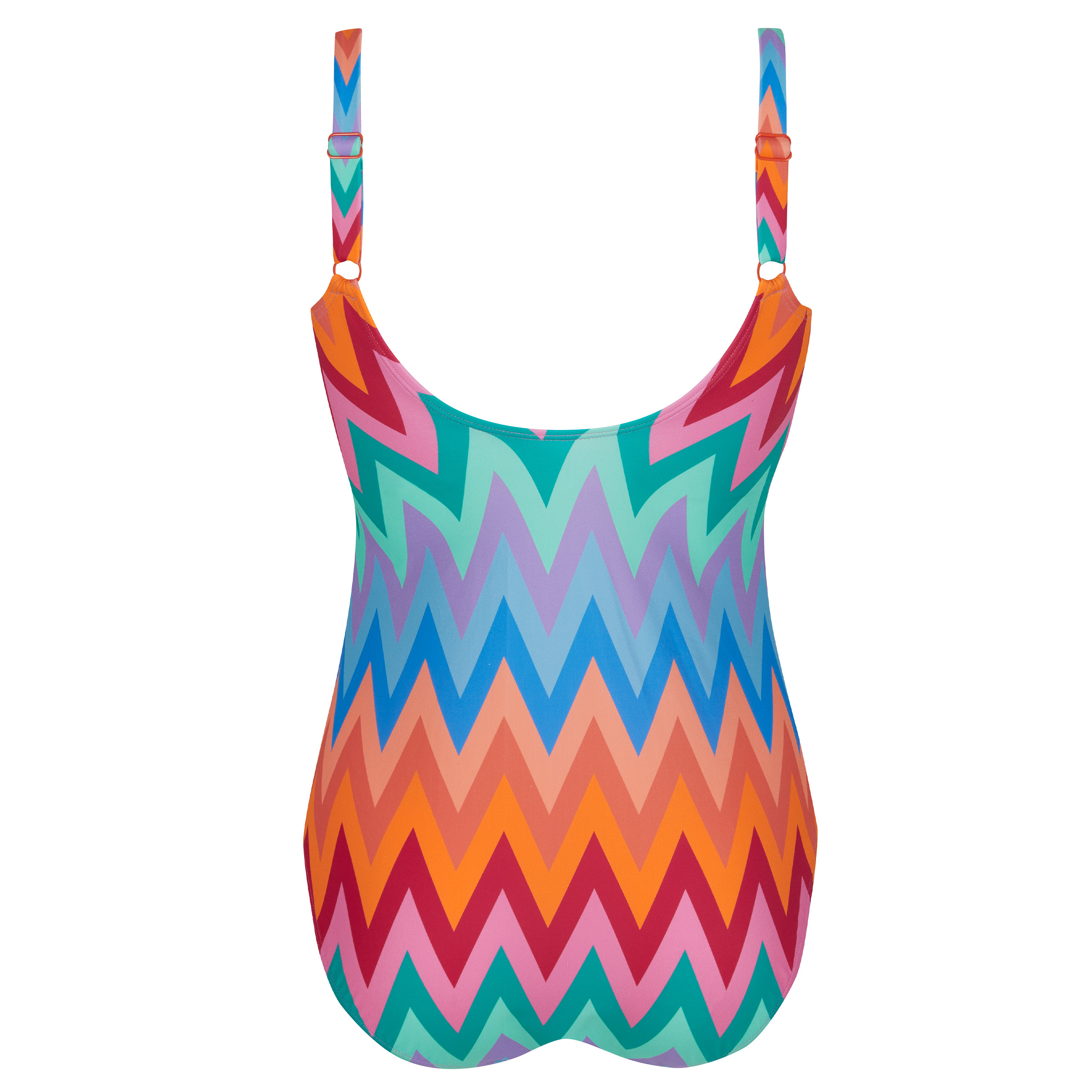 Elegancki strój kąpielowy jednoczęściowy z pięknym, intensywnym nadrukiem kolorowych zygzaków. Kostium zapewnia doskonałą ochronę wrażliwej skóry i blizn przed promieniowaniem UV 50+.