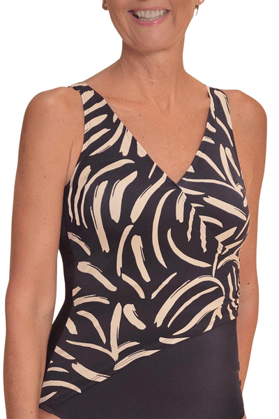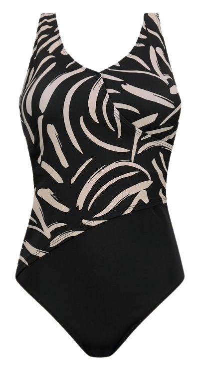 Amoena Turin FB 71793 to elegancki, jednoczęściowy kostium kąpielowy dla amazonek stworzony z myślą o kobietach po mastektomii, po operacjach piersi oraz dla wszystkich pań, które szukają stroju modelującego sylwetkę, zapewniającego większe krycie i komfort. Połączenie czerni z modnym wzorem przypominającym pociągnięcia pędzla w kolorach ziemi optycznie wysmukla figurę i dodaje stylu na plaży oraz basenie.